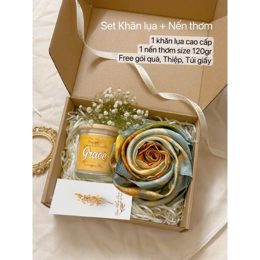 Chi tiết Set quà tặng cao cấp: khăn lụa & nến thơm gồm có: